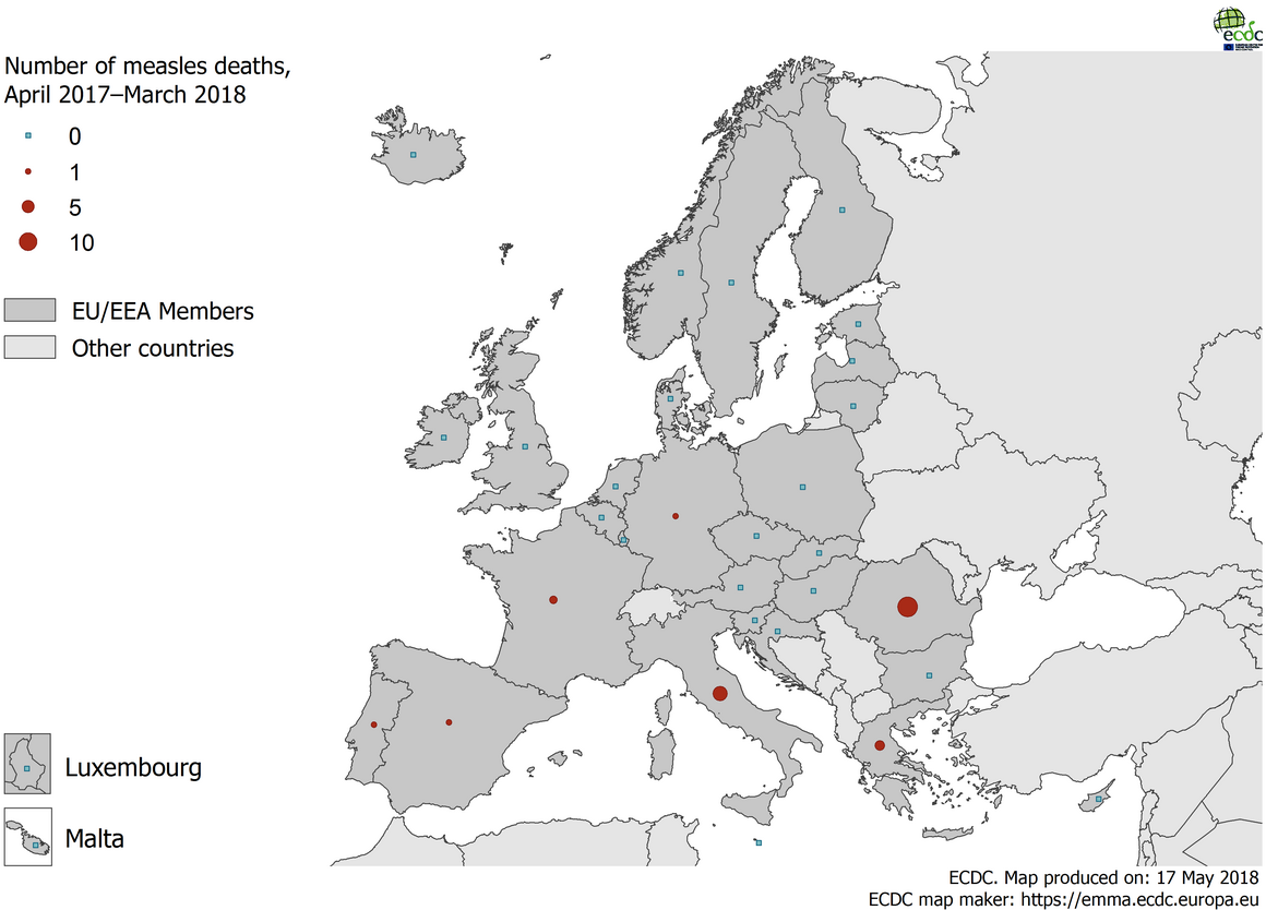 Distribution of measles deaths by country, April 2017–March 2018, EU/EEA countries