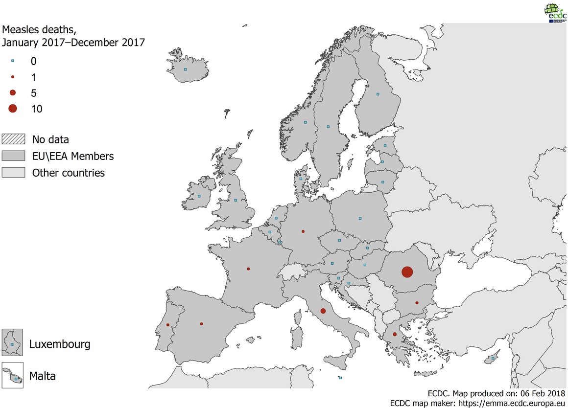 Distribution of measles deaths by country, January 2016–December 2017, EU/EEA countries