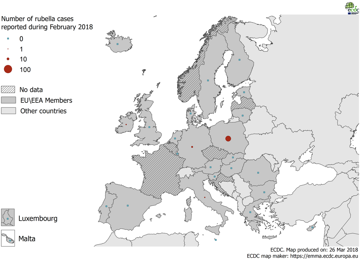 Distribution of rubella cases by country, February 2018 in EU/EEA countries
