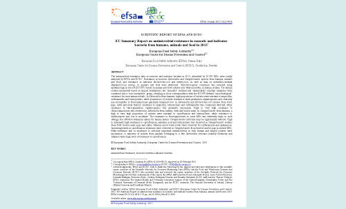 The EFSA-ECDC European Union Summary Report on antimicrobial resistance (AMR) in zoonotic and indicator bacteria from humans, animals and food in 2013 reports information submitted by 28 EU Member States on antimicrobial resistance and analysed by ECDC and EFSA.