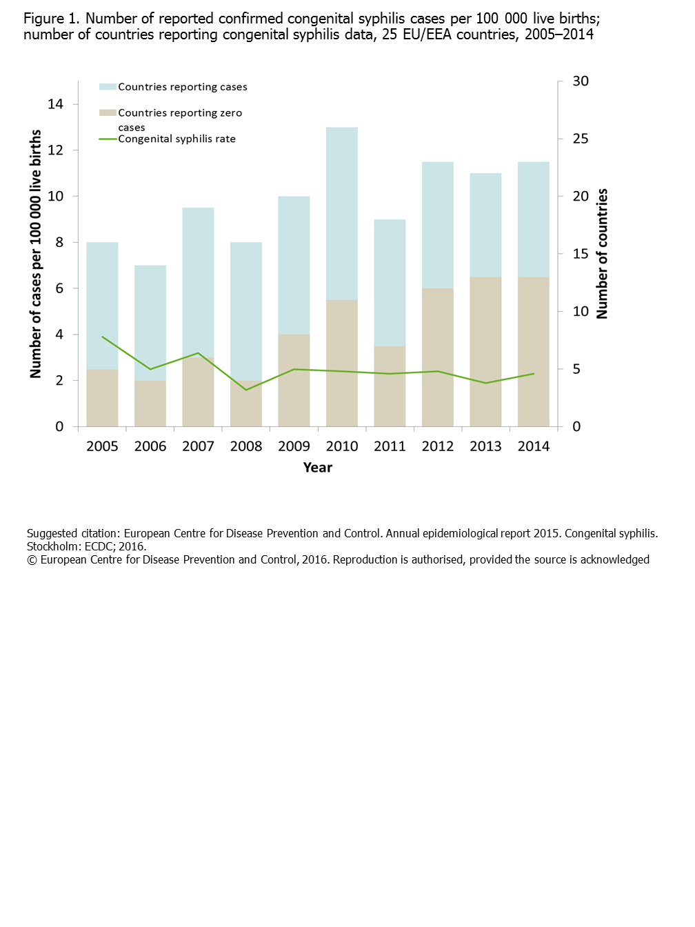 Figure 1. Number of reported confirmed congenital syphilis cases per 100 000 live births; number of countries reporting congenital syphilis data, 25 EU/EEA countries, 2005–2014