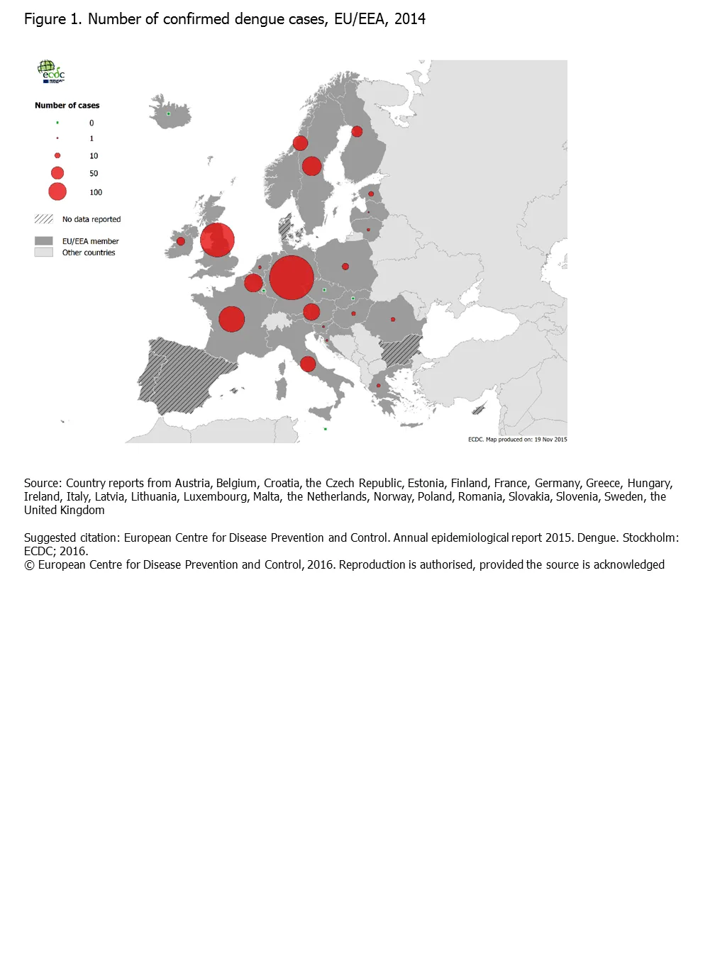 Figure 1. Number of reported dengue cases, EU/EEA, 2014 30 December 2016 Start and end date: 1 January 2014 - 31 December 2014 Number of reported dengue cases, EU/EEA, 2014 fig1.PNG English (184.44 KB - PNG) Download
