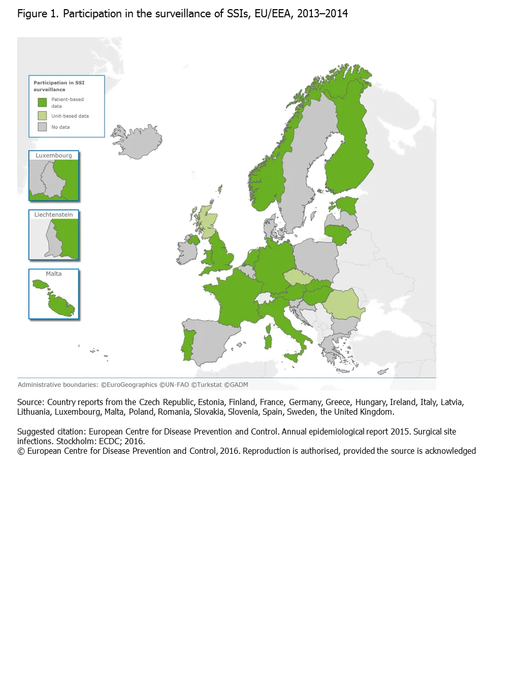 Figure 1. Participation in the surveillance of SSIs, EU/EEA, 2013–2014 Map 30 December 2016 Start and end date: 1 January 2014 - 31 December 2014 Participation in the surveillance of SSIs, EU/EEA, 2013–2014 Slide1.PNG English (239.64 KB - PNG) Download