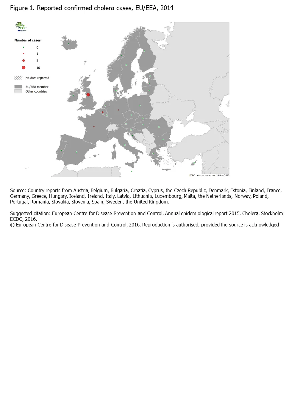 Figure 1. Reported confirmed cholera cases, EU/EEA, 2014 Data 30 January 2017 Start and end date: 1 January 2014 - 31 December 2014 Reported confirmed cholera cases, EU/EEA, 2014 Slide1.PNG English (157.77 KB - PNG) Download