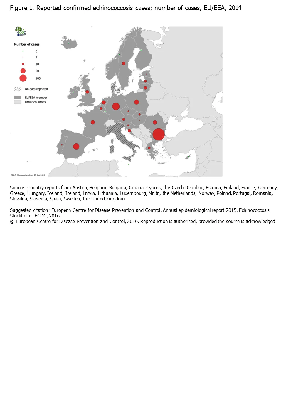 Figure 1. Reported confirmed echinococcosis cases: number of cases, EU/EEA, 2014 30 December 2016 Start and end date: 1 January 2014 - 31 December 2014 Reported confirmed echinococcosis cases: number of cases, EU/EEA, 2014 Slide1.PNG English (190.21 KB - PNG) Download