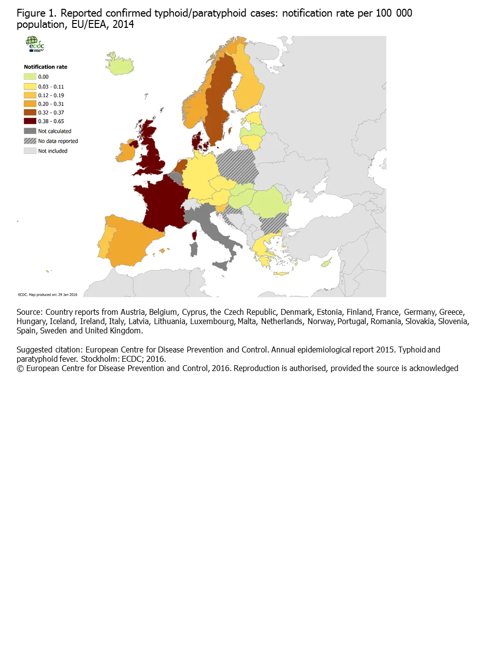 Figure 1. Reported confirmed typhoid/paratyphoid cases: notification rate per 100 000 population, EU/EEA, 2014