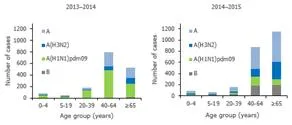 Figure 2. Number of cases admitted to selected intensive care units by (sub-)types and age groups; Finland, France, Ireland, Romania, Slovakia, Spain, Sweden and the United Kingdom, 2013–2014 and 2014–2015