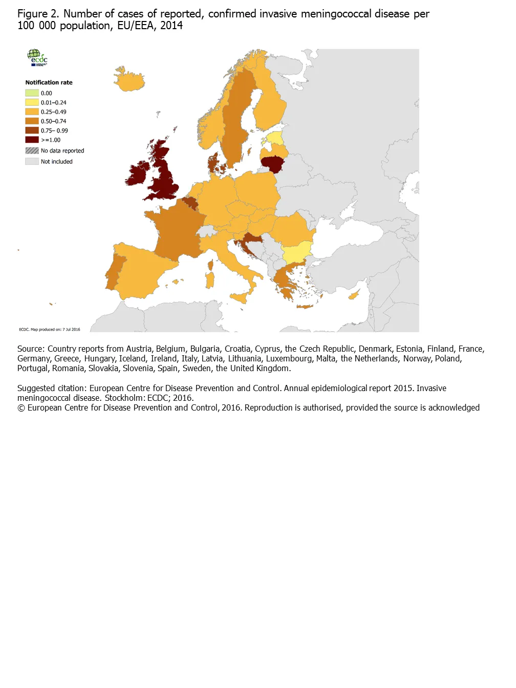 Figure 2. Number of cases of Reported confirmed invasive meningococcal disease per 100 000 population, EU/EEA, 2014