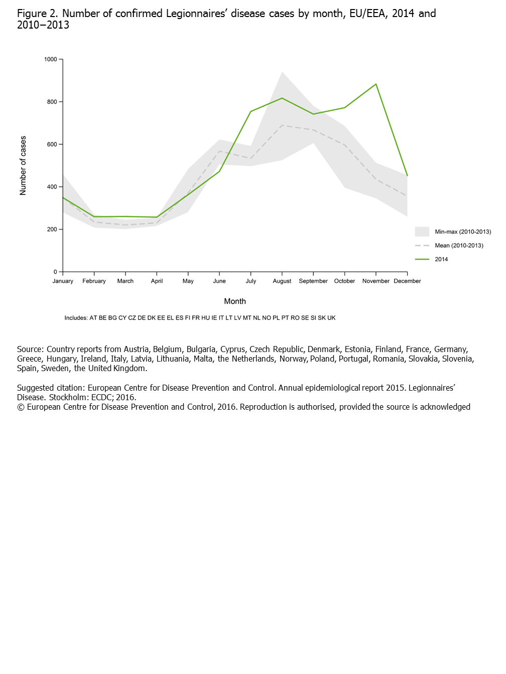 Figure 2. Number of confirmed Legionnaires’ disease cases by month, EU/EEA, 2014 and 2010−2013