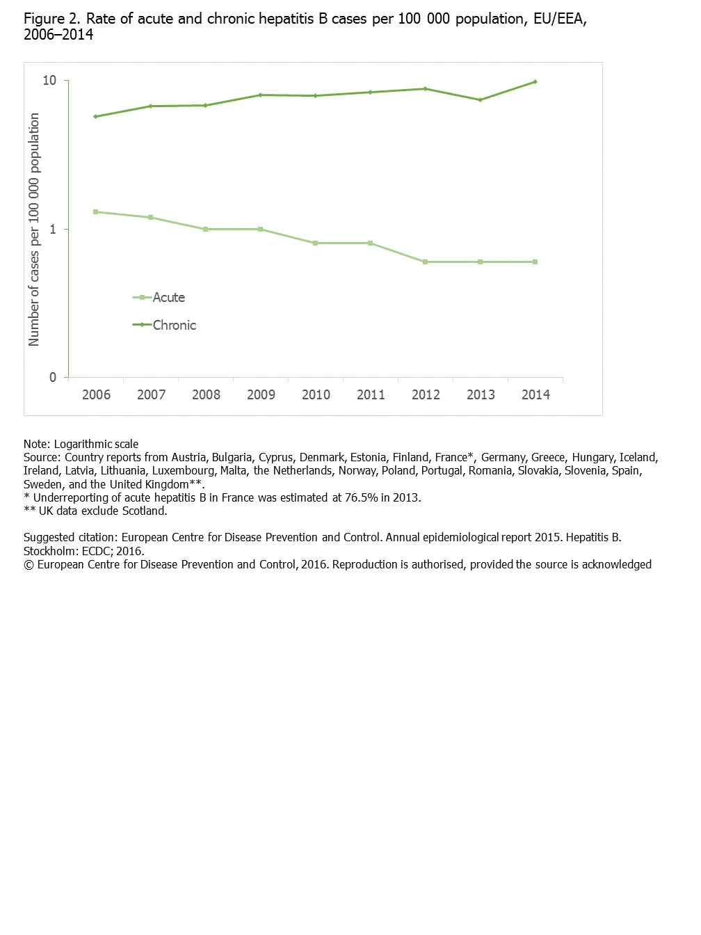 Figure 2. Rate of acute and chronic hepatitis B cases per 100 000 population, EU/EEA, 2006–2014