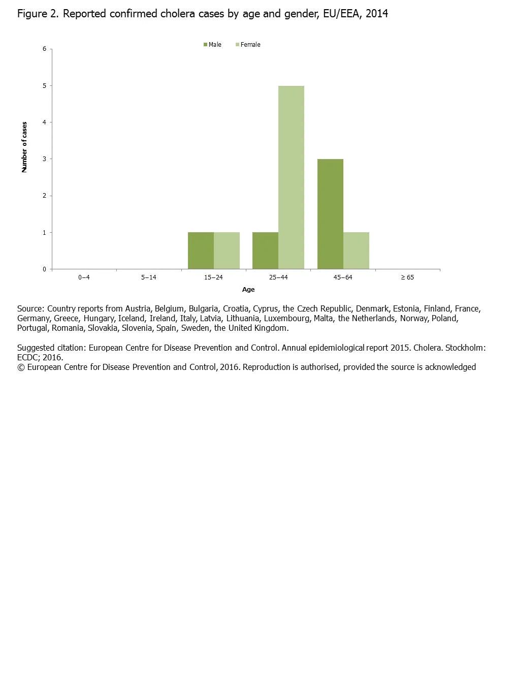 Figure 2. Reported confirmed cholera cases by age and gender, EU/EEA, 2014 Graph 30 January 2017 Start and end date: 1 January 2014 - 31 December 2014 Reported confirmed cholera cases by age and gender, EU/EEA, 2014 Slide2.PNG English (30.06 KB - PNG) Download