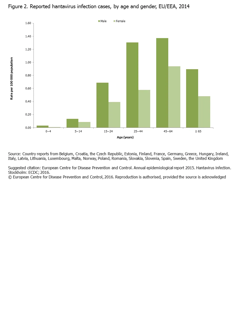 Figure 2. Reported hantavirus infection cases, by age and gender, EU/EEA, 2014 Graph 30 December 2016 Start and end date: 1 January 2014 - 31 December 2014 Reported hantavirus infection cases, by age and gender, EU/EEA, 2014 fig2.PNG English (34.15 KB - PNG) Download