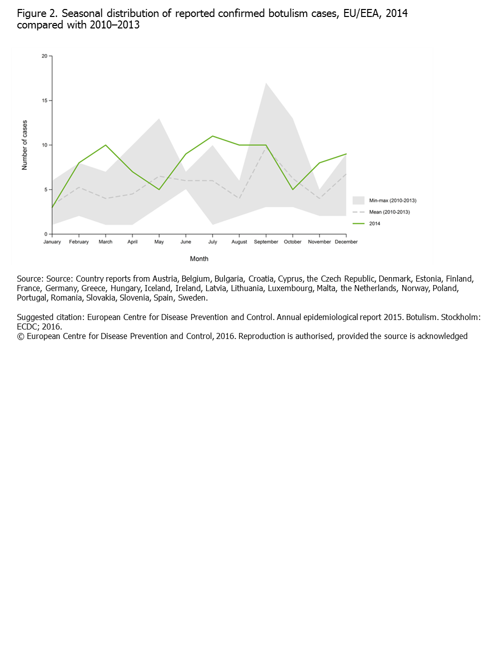 Figure 2. Seasonal distribution of reported confirmed botulism cases, EU/EEA, 2014 compared with 2010–2013