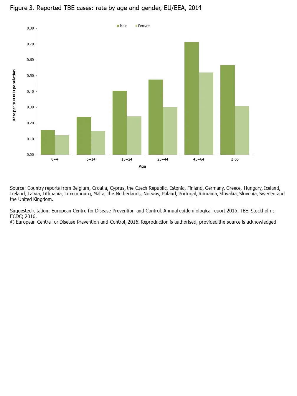 Figure 3. Confirmed TBE cases, by age and gender, EU/EEA, 2014 Graph 30 December 2016 Start and end date: 1 January 2014 - 31 December 2014 Confirmed TBE cases, by age and gender, EU/EEA, 2014 fig3.PNG English (34.48 KB - PNG) Download