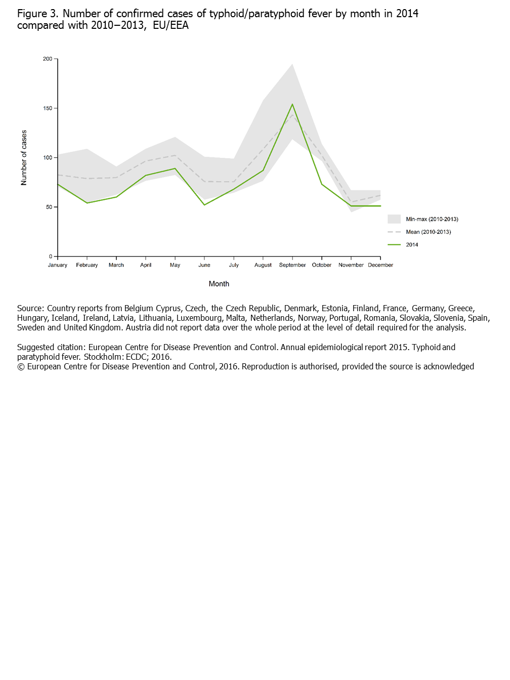 Figure 3. Number of confirmed cases of typhoid/paratyphoid fever by month in 2014 compared with 2010−2013, EU/EEA