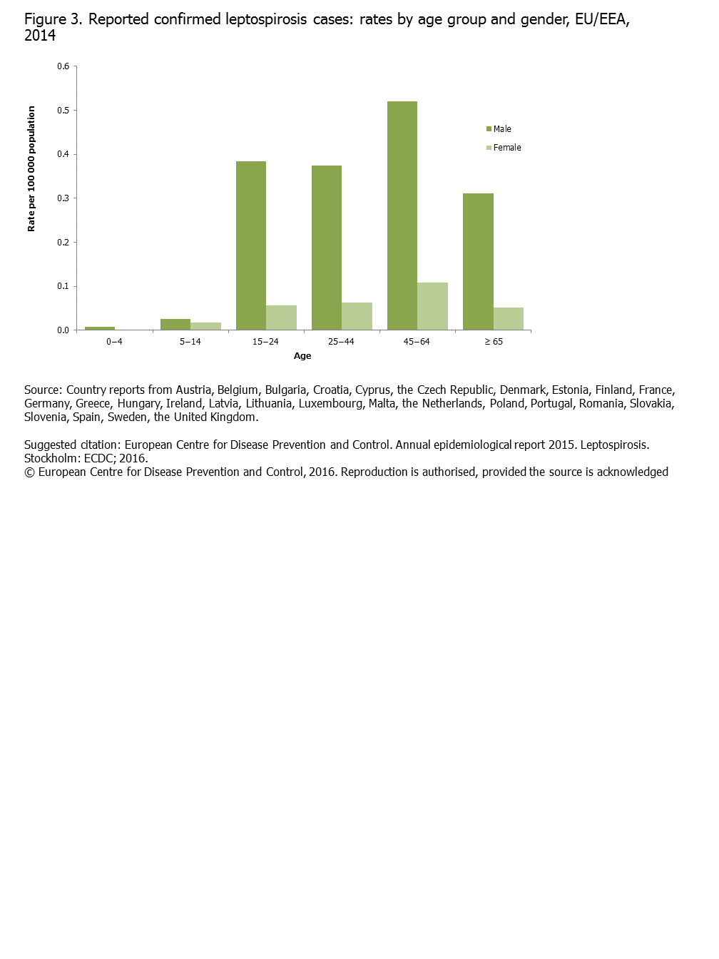 Figure 3. Reported confirmed leptospirosis cases: rates by age group and gender, EU/EEA, 2014