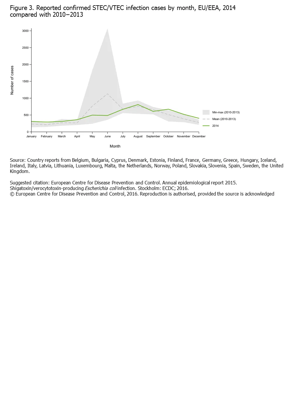 Figure 3. Reported confirmed STEC/VTEC infection cases by month, EU/EEA, 2014 compared with 2010−2013