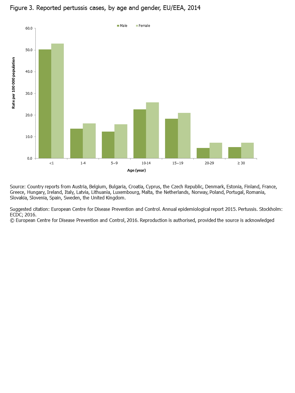 Figure 3. Reported pertussis cases, by age and gender, EU/EEA, 2014
