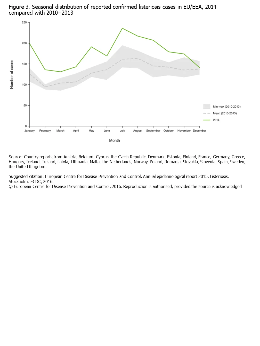 Figure 3. Seasonal distribution of reported confirmed listeriosis cases in EU/EEA, 2014 compared with 2010−2013