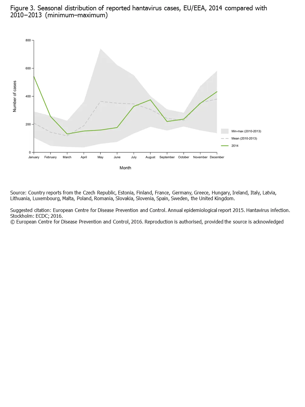 Figure 3. Seasonal distribution of reported hantavirus infection cases, EU/EEA, 2014 compared with 2010−2013