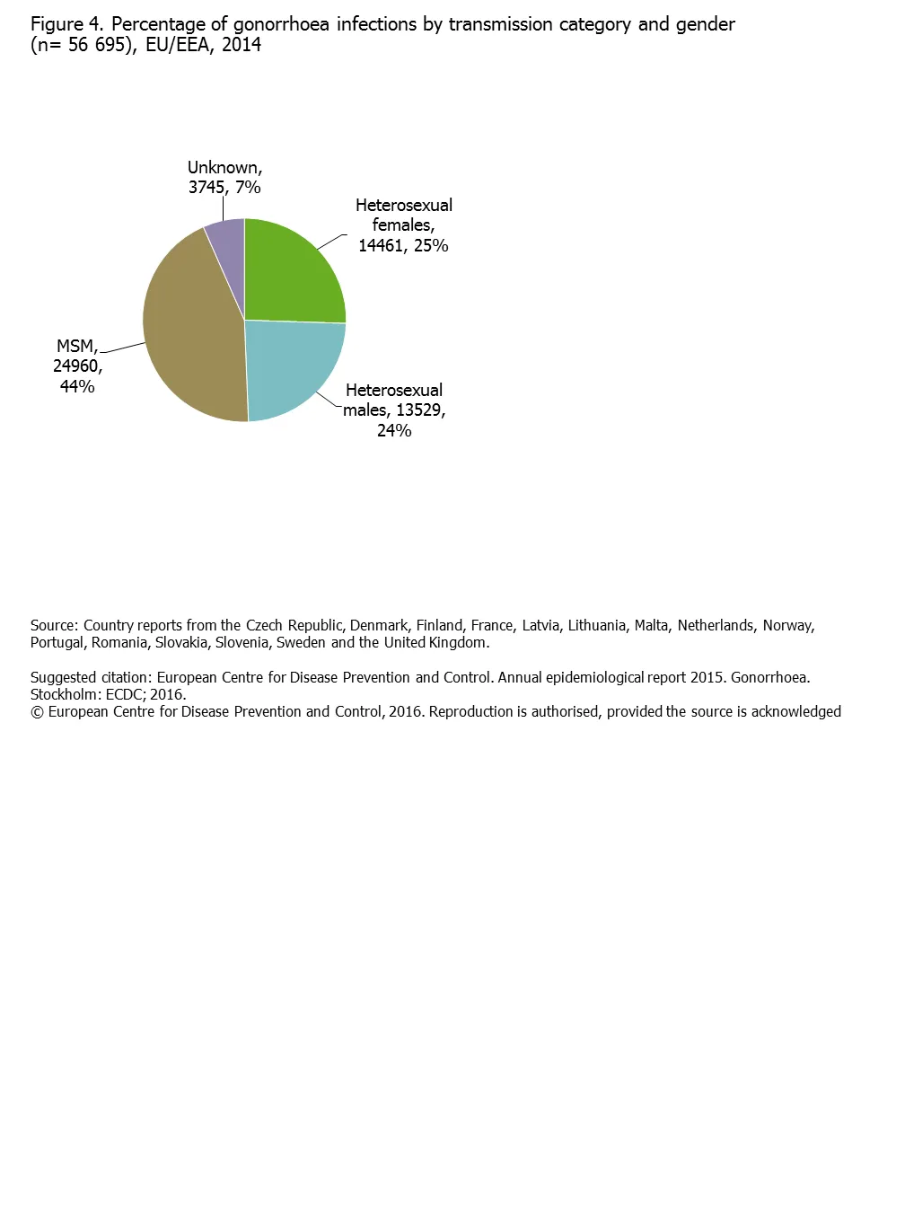 Percentage of gonorrhoea infections by transmission category and gender (n=56 695), EU/EEA, 2014