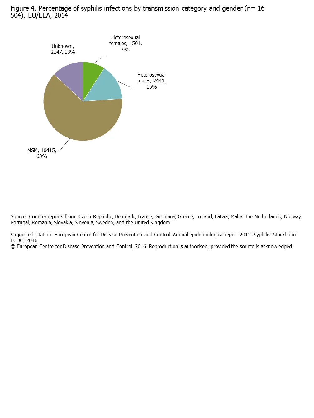 Percentage of syphilis infections by transmission category and gender (n= 16 504), EU/EEA, 2014