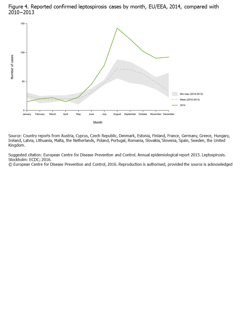 Figure 4. Reported confirmed leptospirosis cases by month, EU/EEA, 2014, compared with 2010−2013