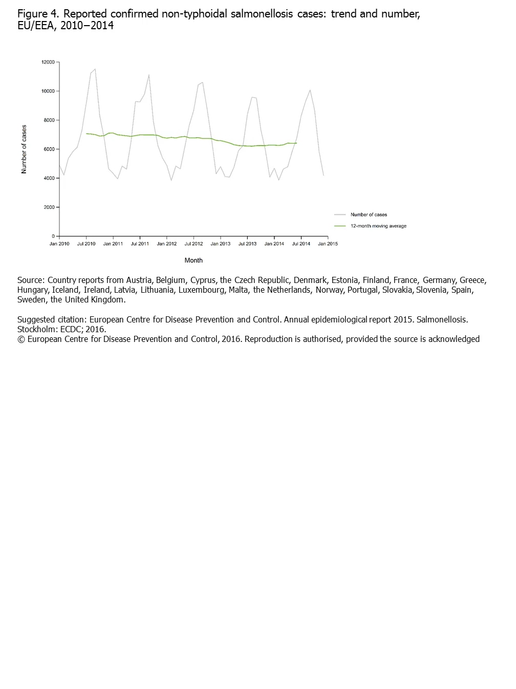Figure 4. Reported confirmed non-typhoidal salmonellosis cases: trend and number, EU/EEA, 2010−2014