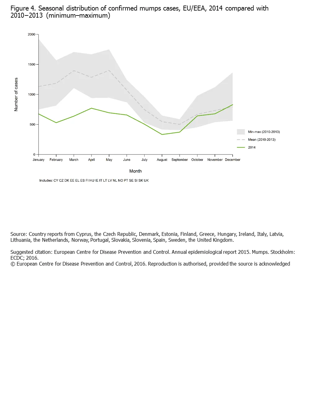 Figure 4. Seasonal distribution of reported cases of mumps, EU/EEA, 2014 compared with 2010−2013