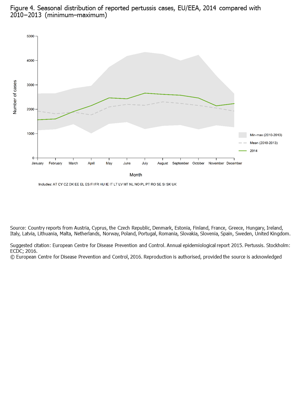 Figure 4. Seasonal distribution of reported pertussis cases, EU/EEA, 2014 compared with 2010−2013