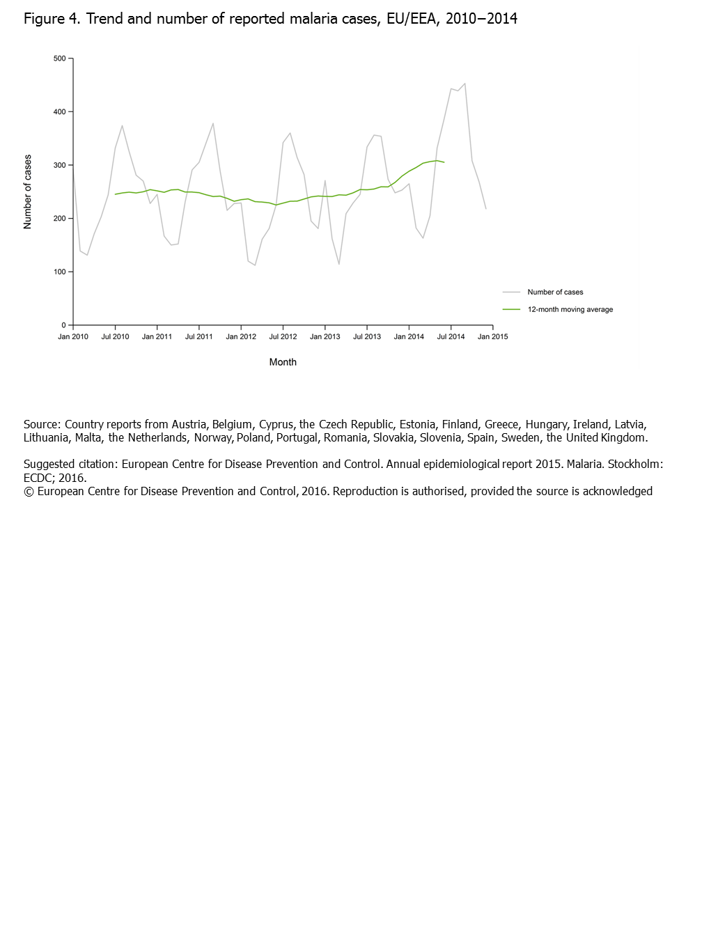 Figure 4: Trend and number of confirmed malaria cases, EU/EEA, 2010−2014