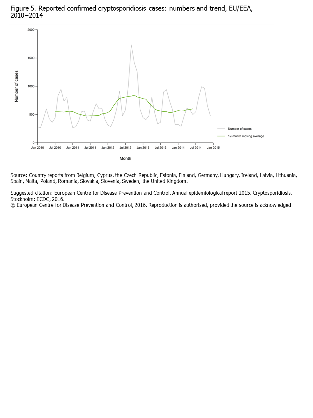 Reported confirmed cryptosporidiosis cases: numbers and trend, EU/EEA, 2010−2014