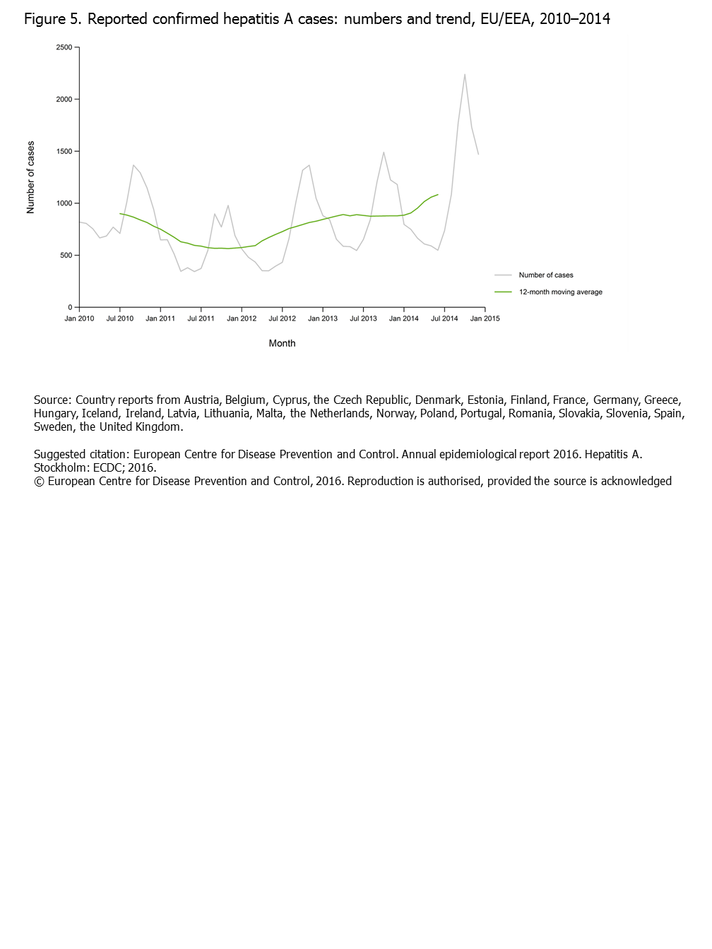 Figure 5. Reported confirmed hepatitis A cases: numbers and trend, EU/EEA, 2010–2014