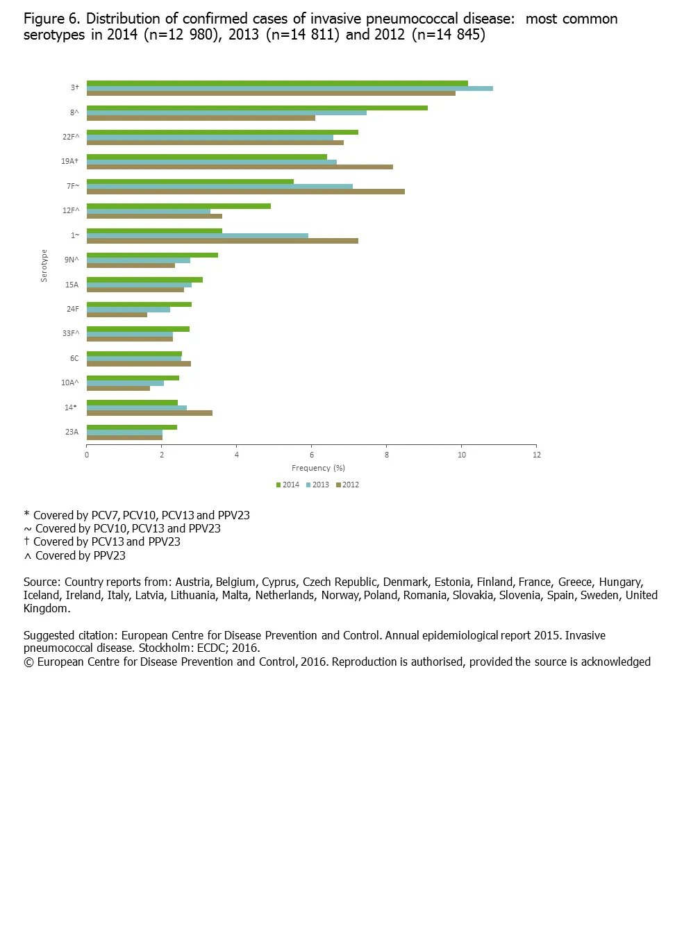 Figure 6. Distribution of confirmed cases of invasive pneumococcal disease: most common serotypes in 2014 (n=12 980), 2013 (n=14 811) and 2012 (n=14 845)
