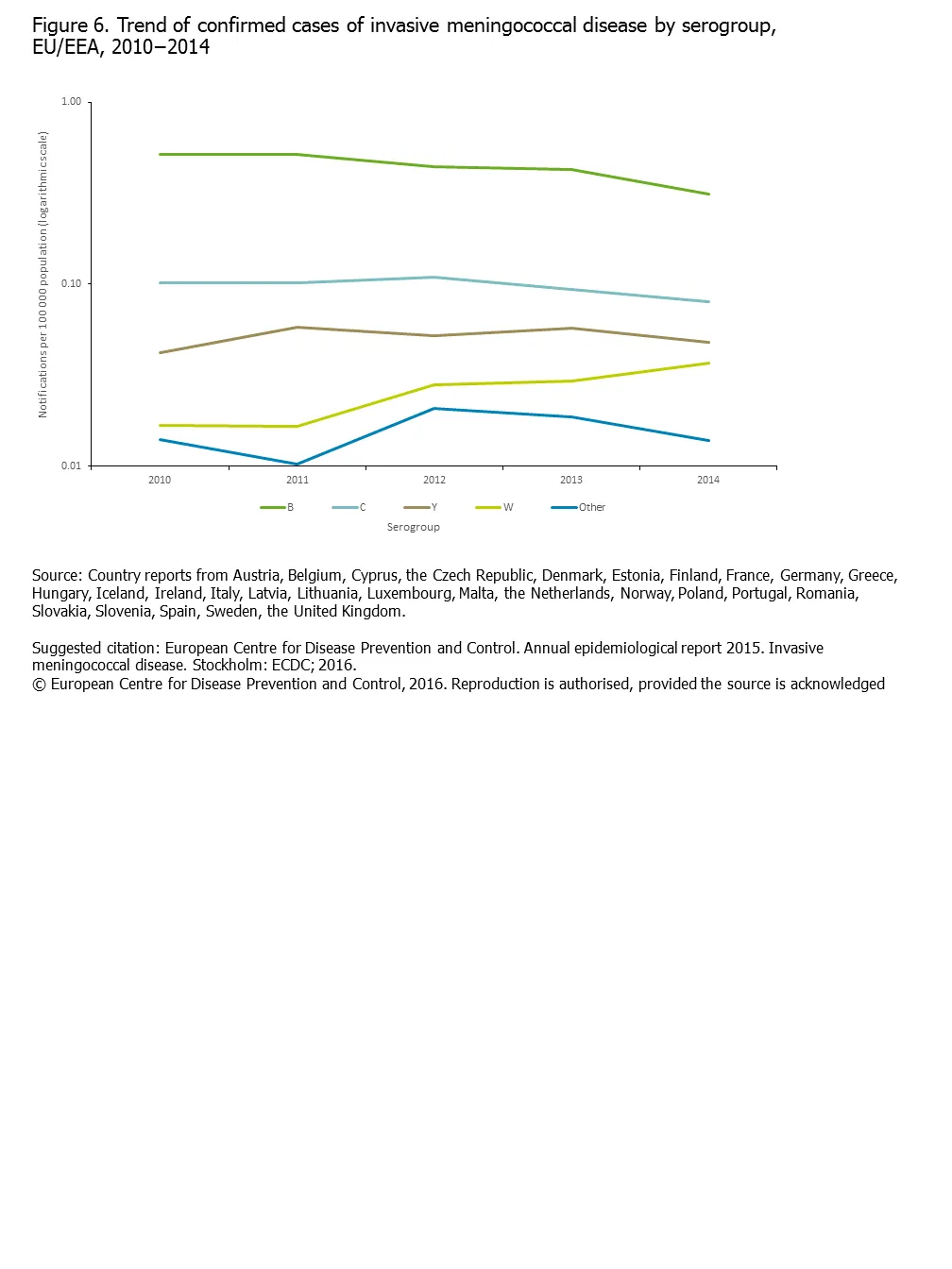 Figure 6. Trend of confirmed cases of invasive meningococcal disease by serogroup, EU/EEA, 2010–2014
