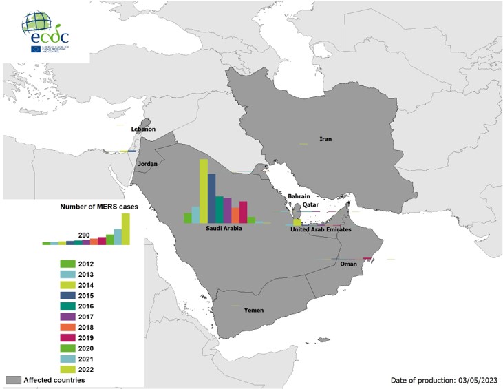 Since the previous update on 11 April 2023, and as of 3 May 2023, no new MERS-CoV cases and no