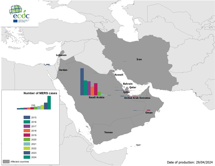 Since April 2012 and as of 29 April 2024, a total of 2 622 cases of MERS, including 950 deaths, have been reported by health authorities worldwide.