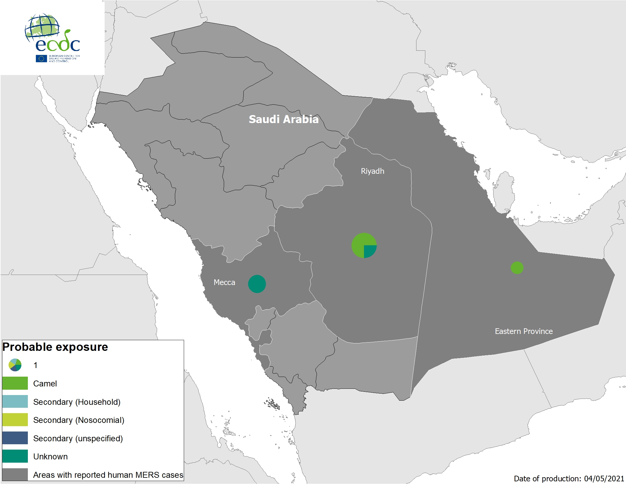 From 1 January 2021 to 3 May 2021, eight MERS-CoV cases have been reported in Saudi Arabia (7) and the United Arab Emirates (1), including four deaths. In Saudi Arabia, all were primary cases, of whom four reported contact with camels. These seven cases were reported in Riyadh (4), Makkah (2), and Eastern Province (1).
