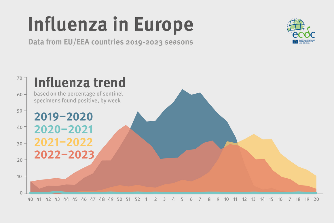 The 2022/2023 influenza season marked the return of influenza virus activity at almost pre-pandemic levels in the EU/EEA countries. This season was characterized by an earlier start of the seasonal epidemic and earlier peak in positivity compared to the four previous seasons.