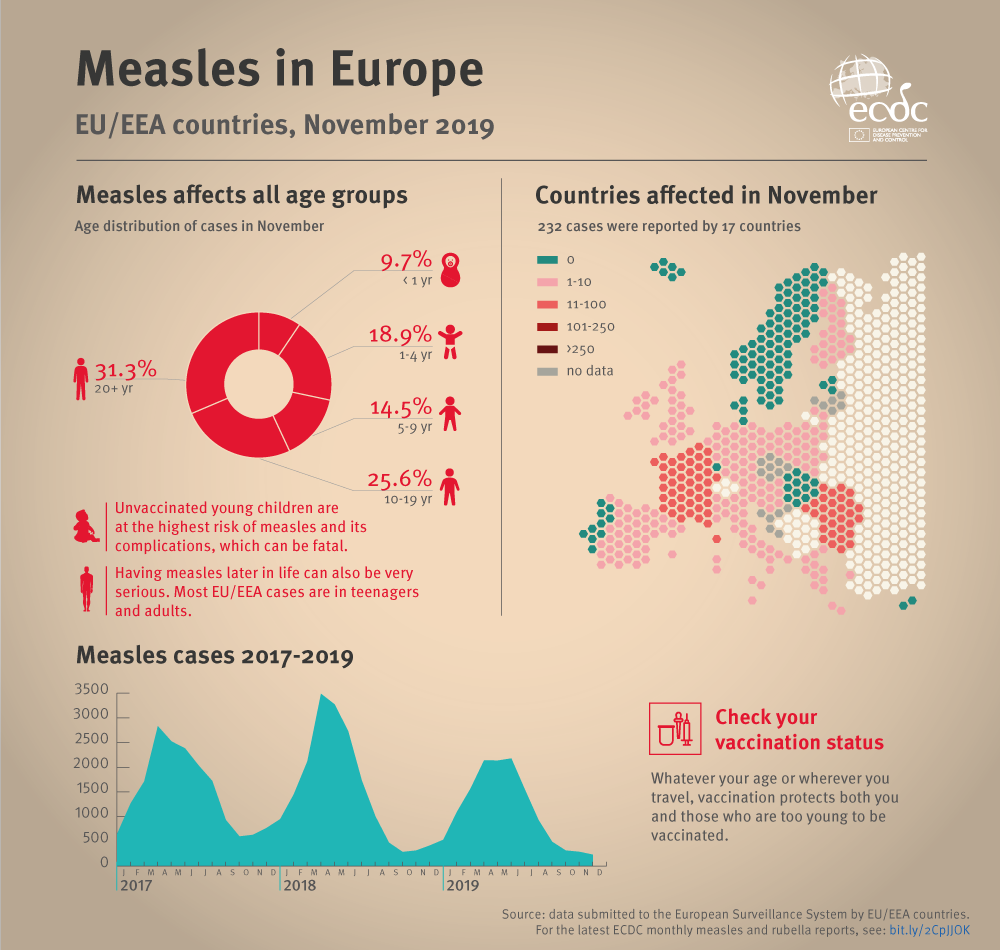 Infographic showing the age distribution of measles cases and the countries affected in November and the number of measles cases 2017-2019.