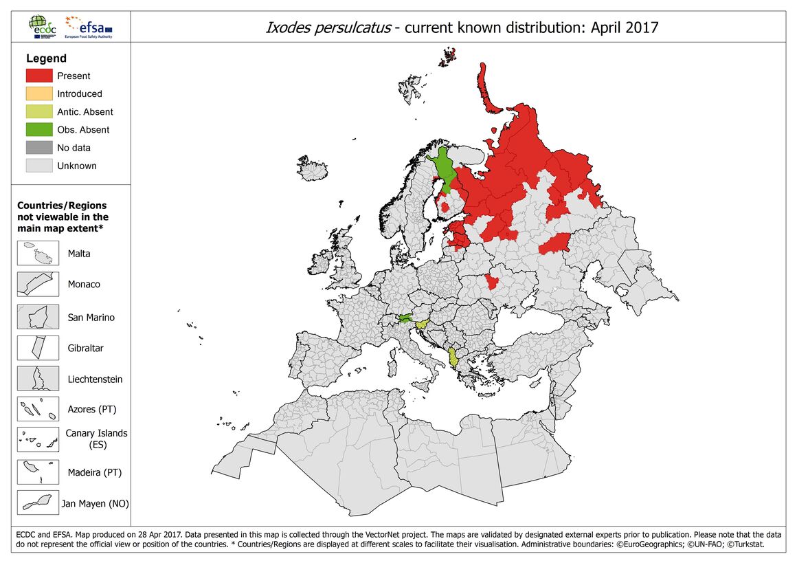 Ixodes persulcatus - current known distribution in Europe, April 2017