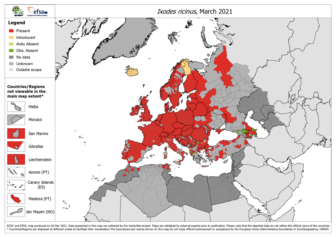 Suggested citation: European Centre for Disease Prevention and Control and European Food Safety Authority. Tick maps [internet]. Stockholm: ECDC; 2021. Available from: https://ecdc.europa.eu/en/disease-vectors/surveillance-and-disease-data/tick-maps