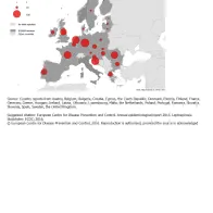 There is no clear geographical pattern in the distribution of rates per 100 000 population due to the low number of reported cases per country. Overall, Scandinavian and Baltic countries have lower numbers of reported confirmed cases than other geographical areas in the EU in 2014.