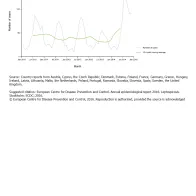 Leptospirosis has a marked seasonal pattern, with the majority of cases in Europe occurring between August and October. The relatively small number of cases reported by many countries can make the interpretation of trends in annual cases challenging. Nevertheless, environmental drivers of leptospirosis, including rainfall and higher temperatures, in combination with outdoor activities (leisure or occupational) could explain the seasonal pattern [12].