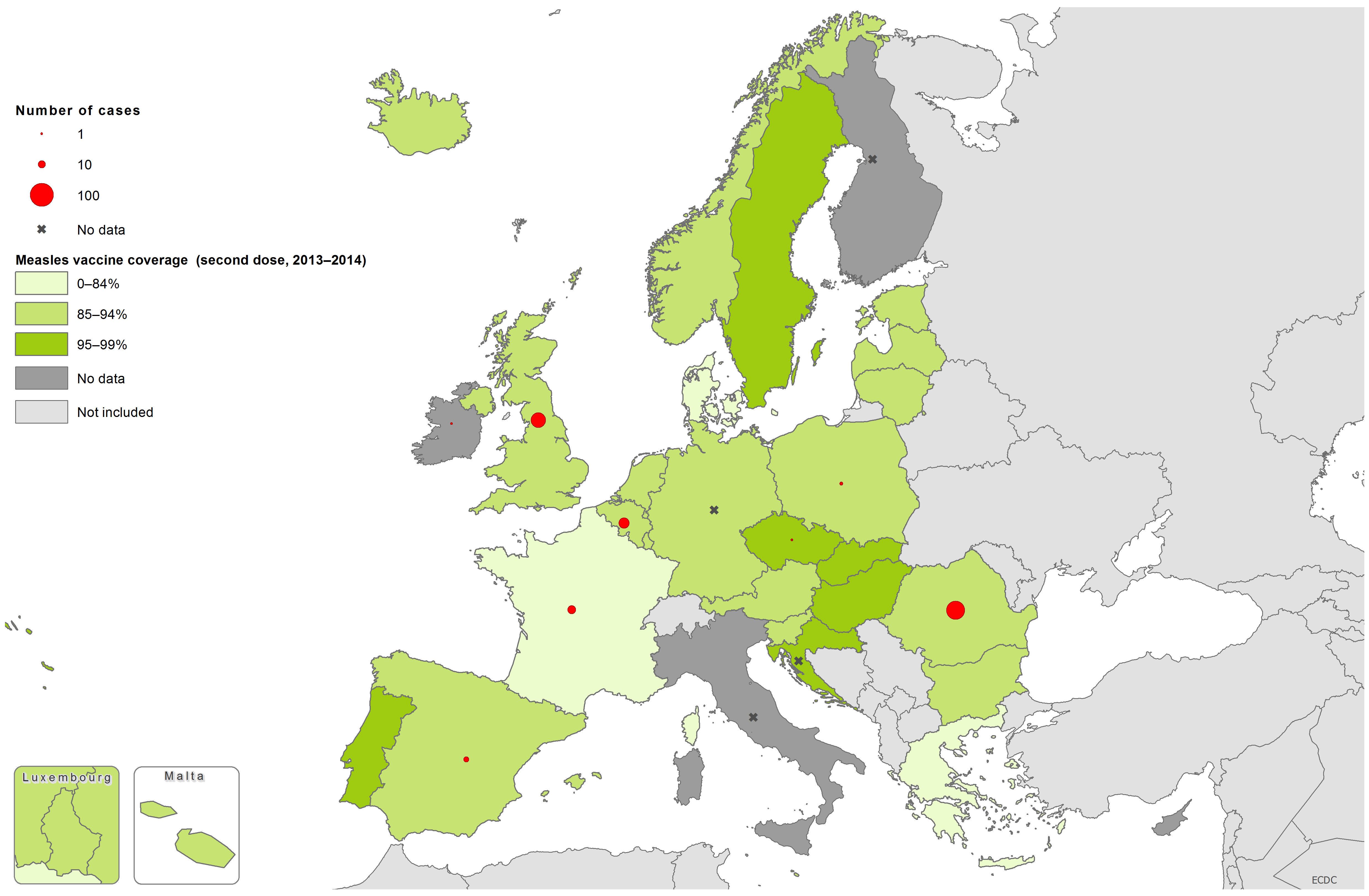 Measles vaccination coverage, second dose, 2013-2014, and number of cases March 2016