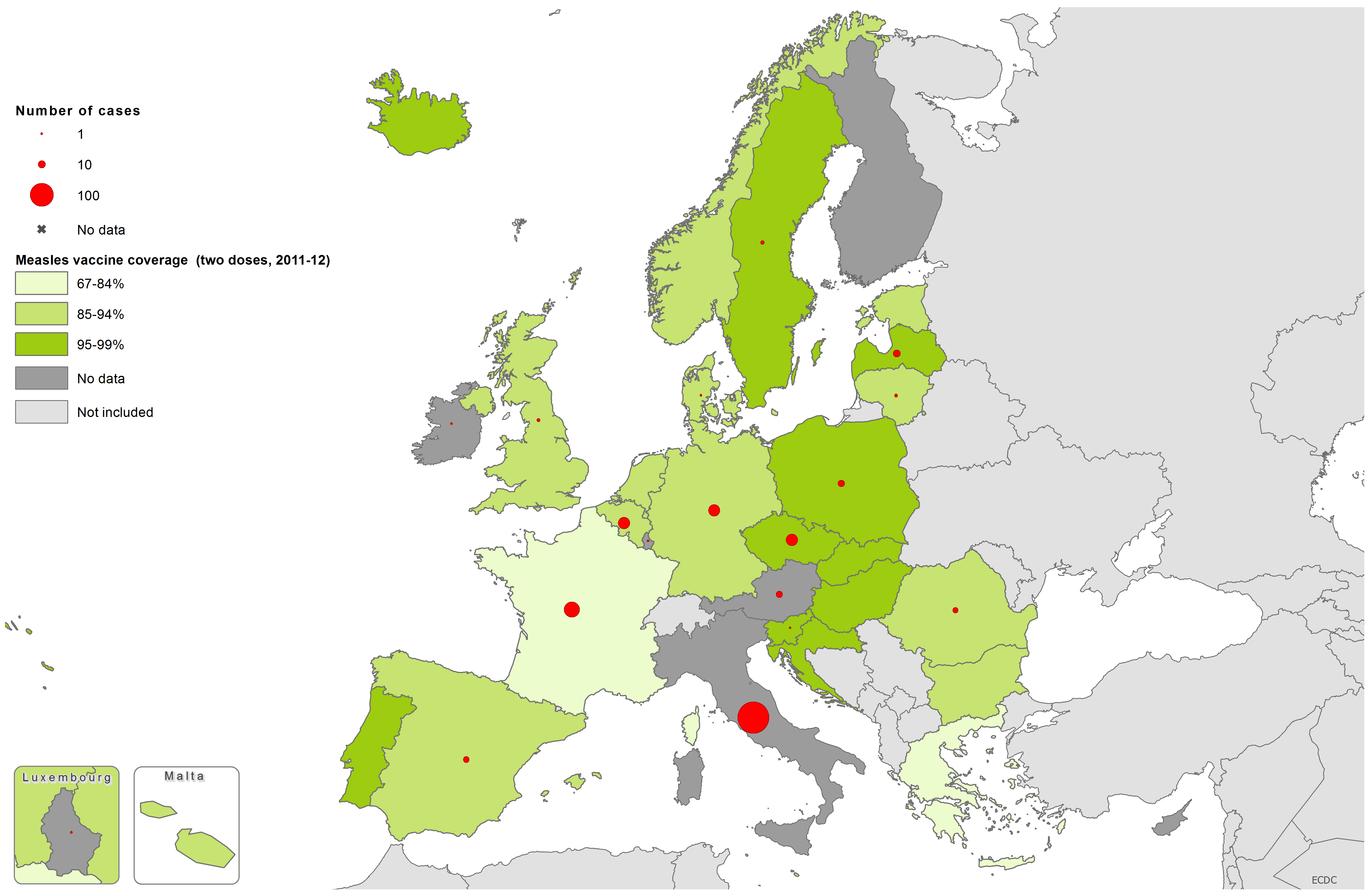Measles vaccination coverage, two doses, 2011–12, and number of cases, May 2014