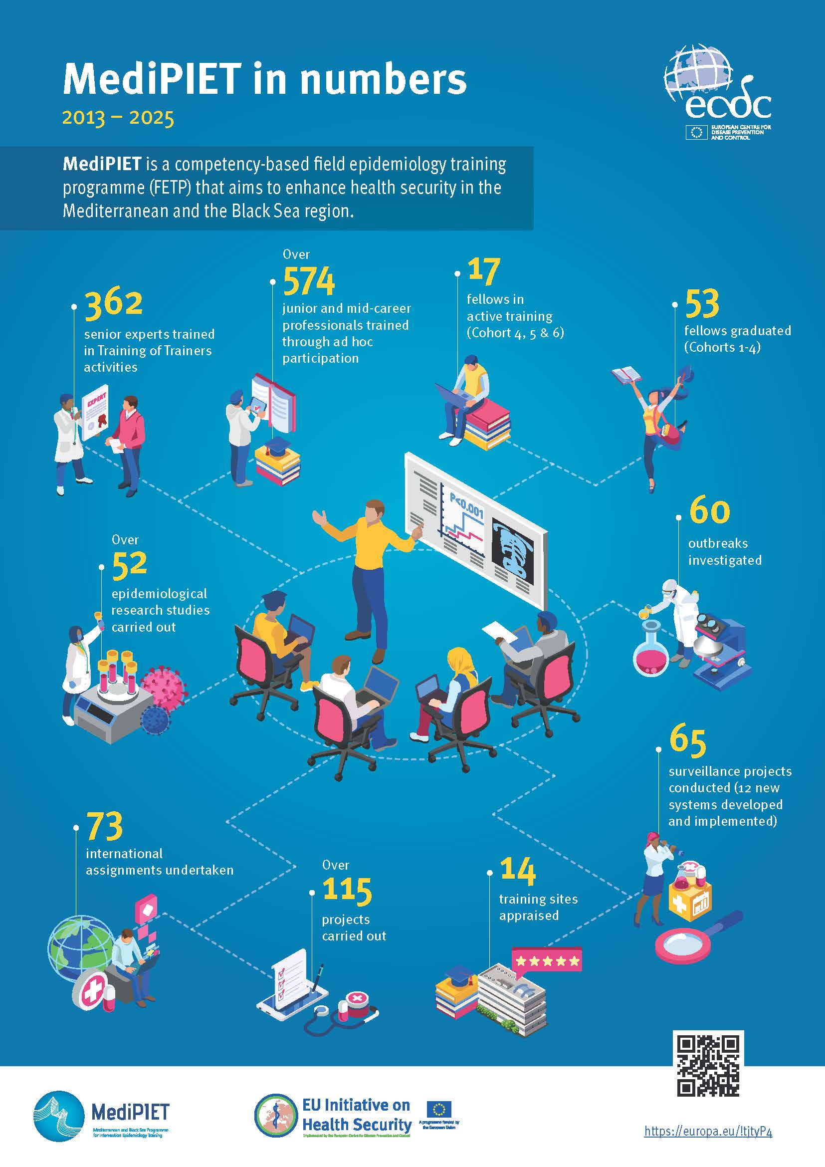 View the main achievements of the Mediterranean and Black Sea Programme for Intervention Epidemiology Training (MediPIET) between 2013 and 2025.