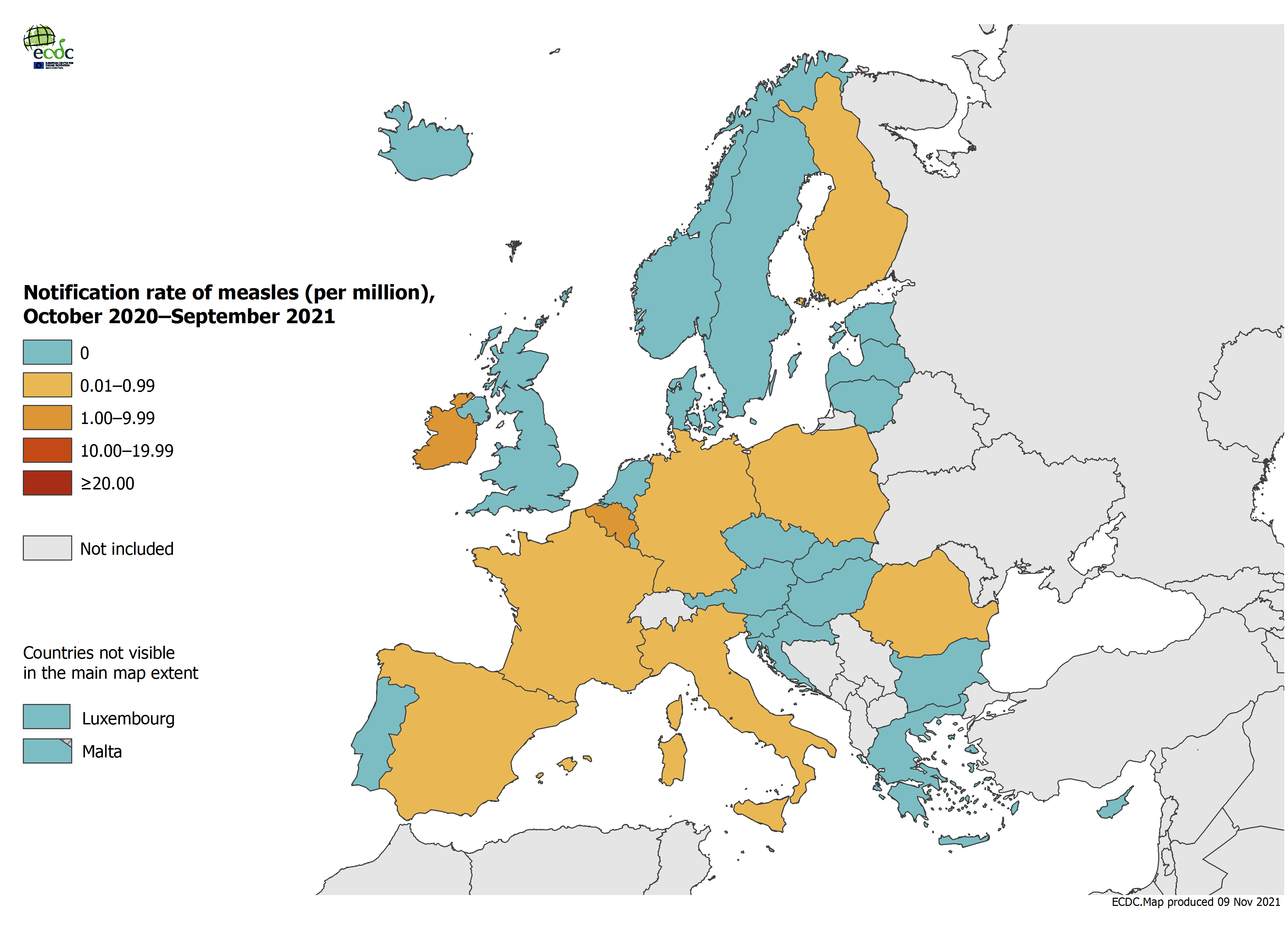 Notification rate of measles per million population by country, October 2020 – September 2021