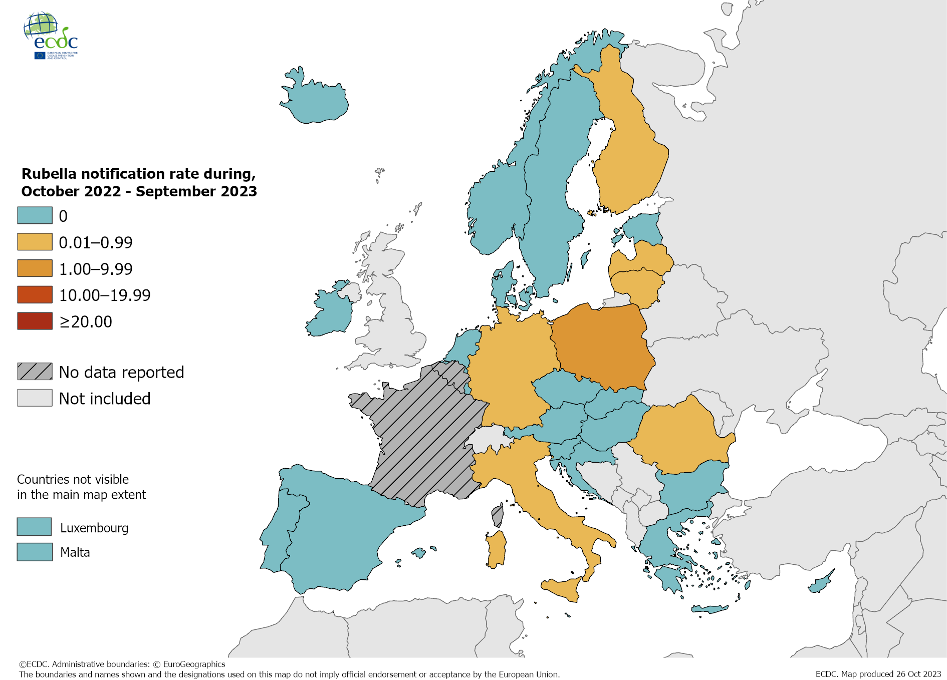 Notification rate of rubella per million population by country, October 2022 - September 2023