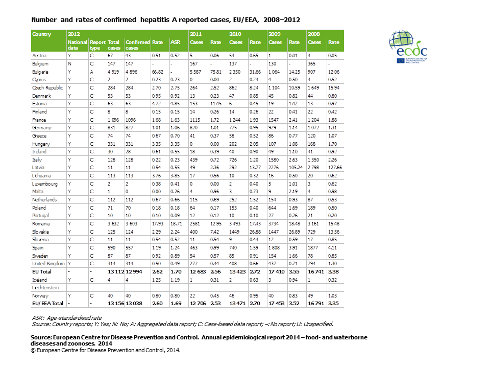Number and rates of confirmed hepatitis A reported cases, EU/EEA, 2008–2012